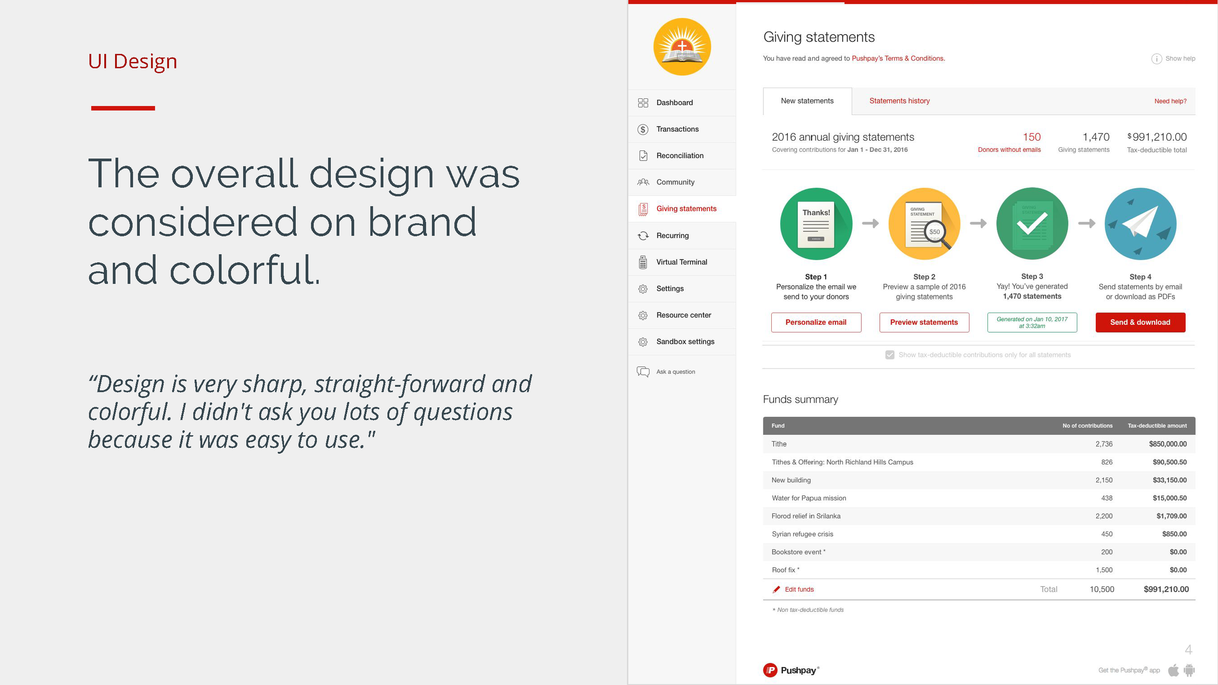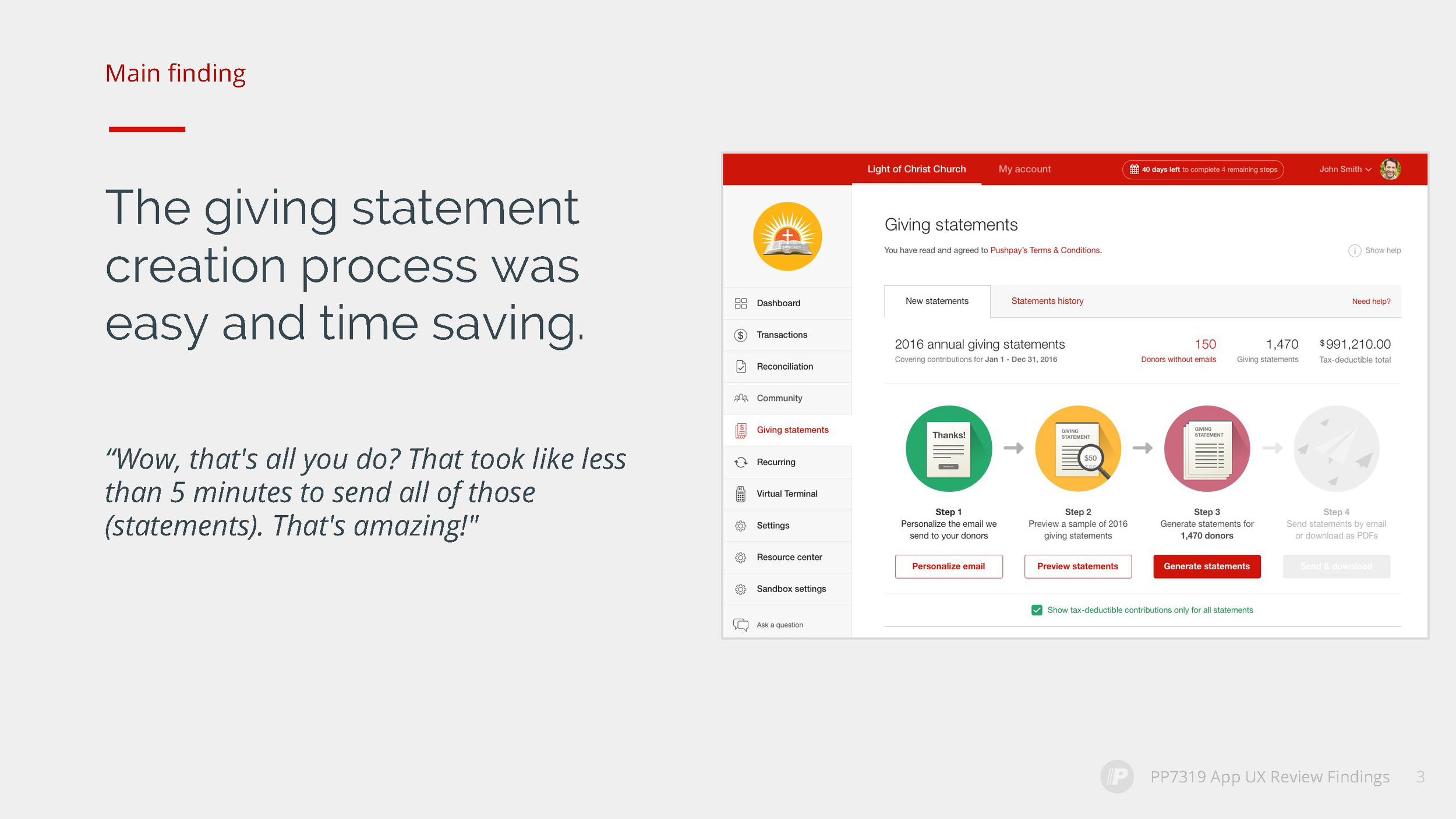 At the end of each year, churches in the United States prepare annual giving statements for their donors so they can claim back tax on their donations. This typically entails an arduous process involving multiple software to consolidate contributions for every single donor. The second part of the task is composing a letterhead detailing how the church is doing that year and what funds these donations were used for. User research showed that it was a time consuming and frustrating process for many financial administrators in the church.